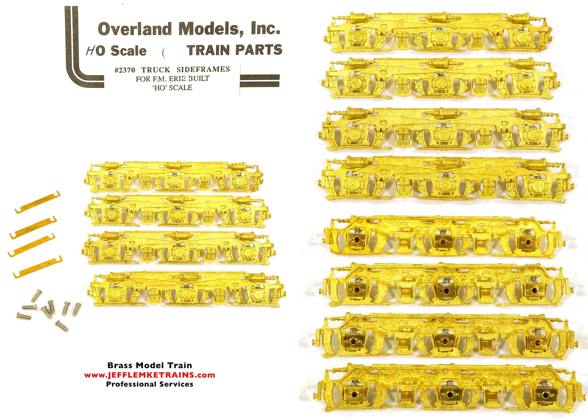 This is the HO Scale Brass OMI 2370 Truck Side Frames for F-M Erie Built Diesel Locomotives Set of Four (4). NEW in zip lock bag just the way it came from the factory. Each set includes the four side frames. There are two lefts and two rights in each set. Also includes the end connectors and screws. We did take the parts out of the packaging to photograph them; then replaced. Overland brought in some of these in the mid-1990s.