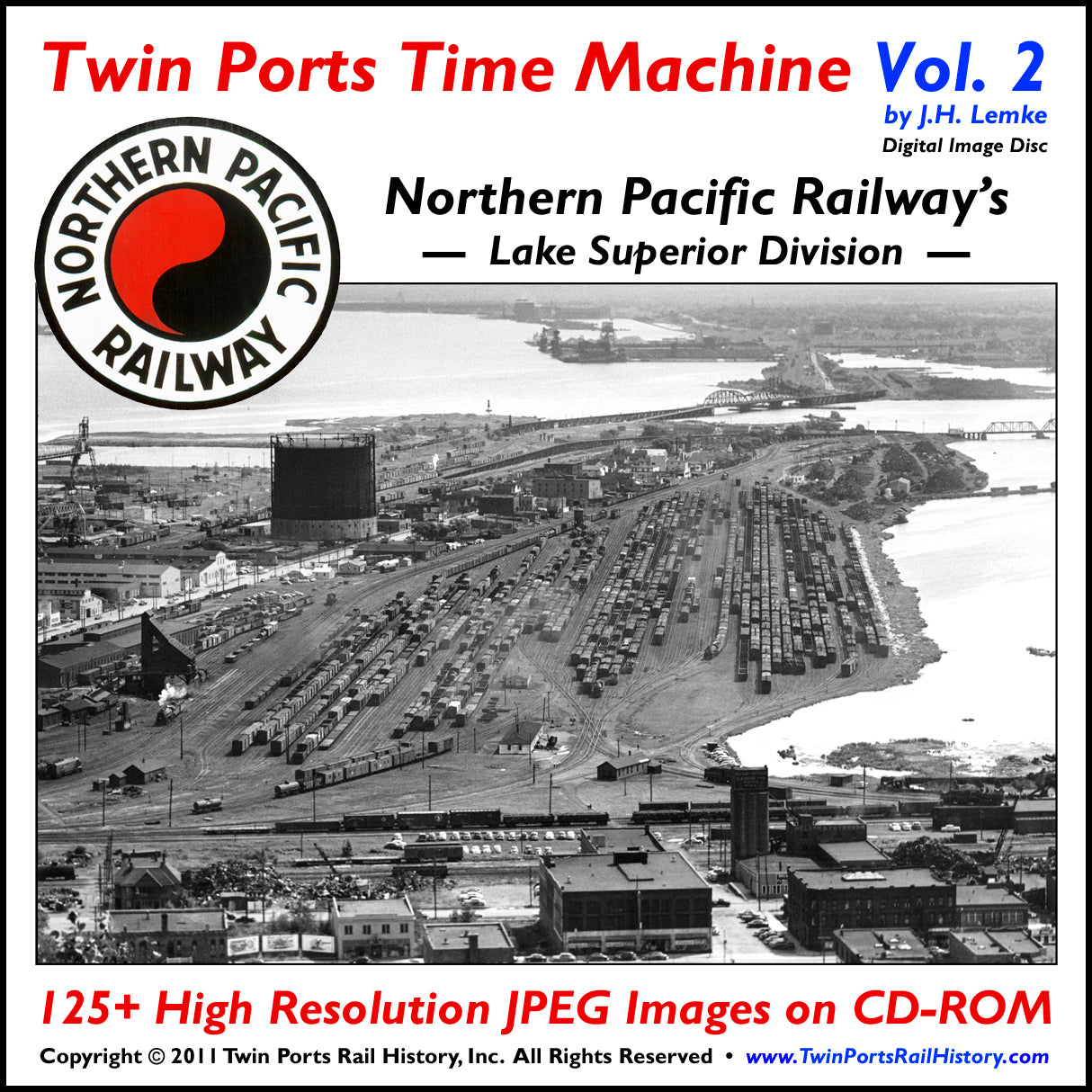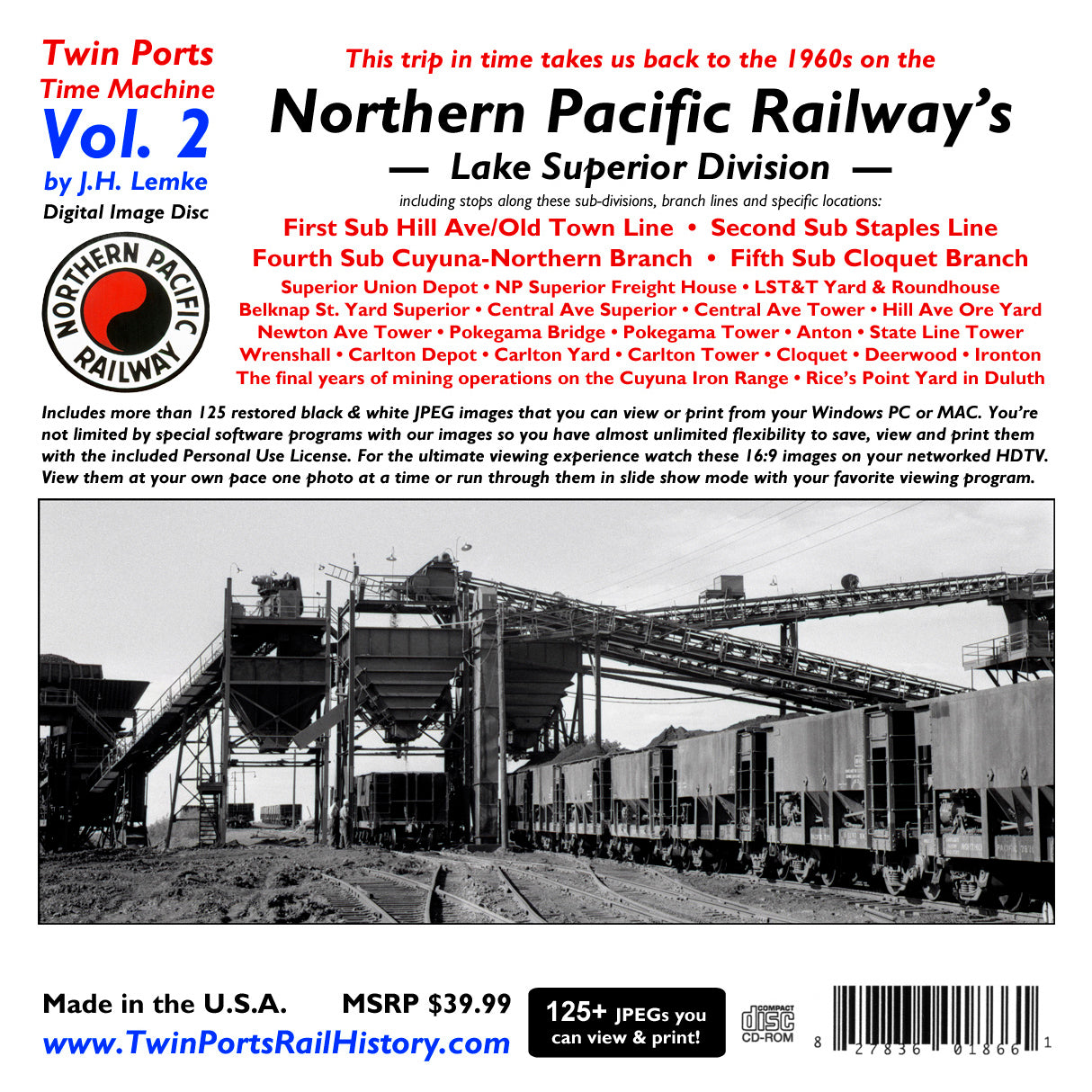 Northern Pacific Railway's Lake Superior Division Twin Ports Time Machine Vol. 2 CD-ROM Digital Image Disc is a factory-new shrink wrapped professionally manufactured digital image disc CD-ROM filled with 150 fully restored digital images (125 shown on cover is a mis-print) that are also 300 dpi printable black & white images from the glory days of the NP operating out of the Duluth-Superior region. Superb views of the railroad mostly from the 1960s. Every image includes the location, date and time of day. Very limited stock remaining at a great price.